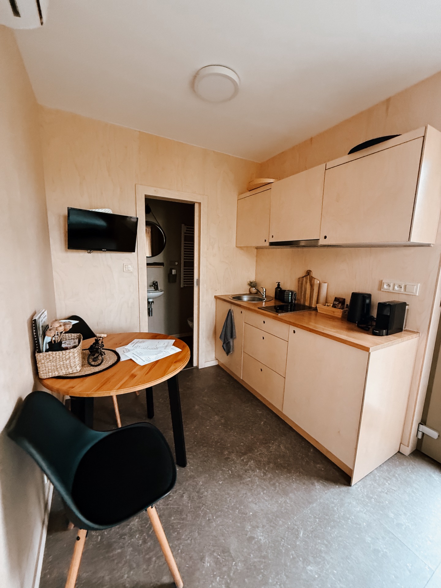 Kuchyňka s kávovarem, konvicí, indukční varnou deskou, lednicí